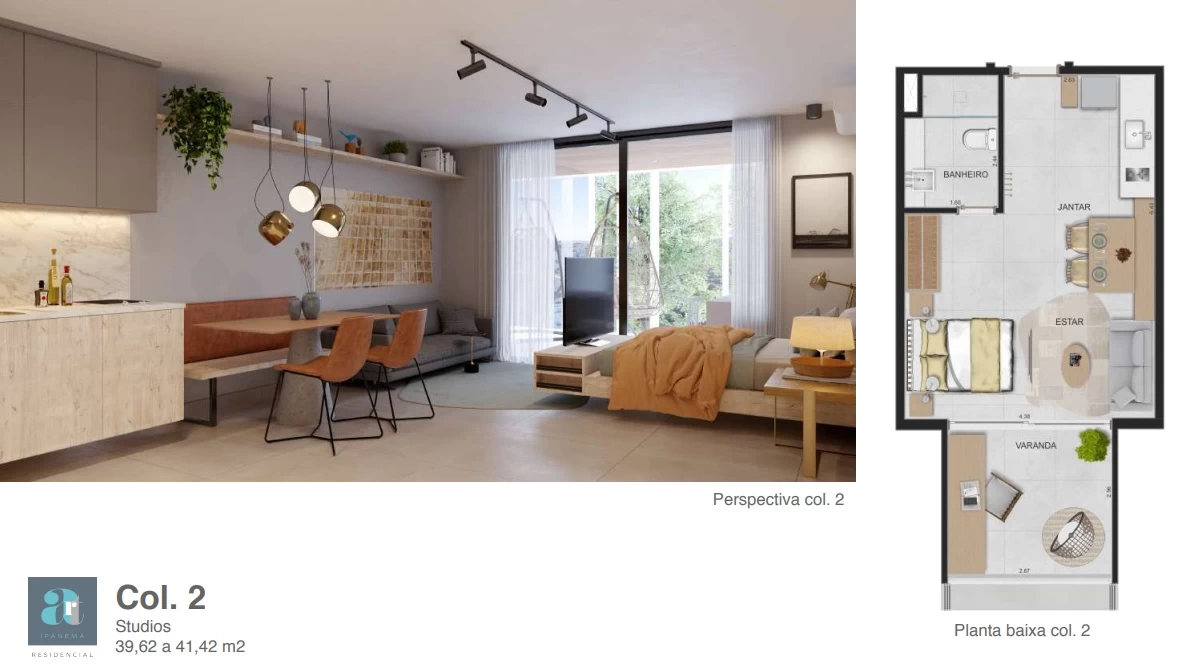 Studios com 39m² a 46m².